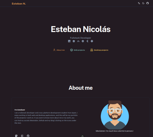 I am a fullstack developer and cross-platform development student from Spain. I enjoy working in both web and desktop applications, and this will be my portfolio of the projects I work on. If you want to know more about me or my work, you can find my socials (Mastodon, Github and my blog) clicking on the icons under this text.
